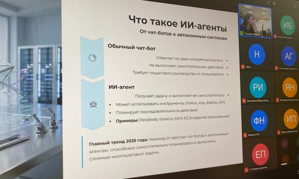 В рамках мини-курса М.А. Груздева рассказала о типах генеративных моделей и ИИ-агентов, главных принципах работы с ИИ в науке, этических и законодательных аспектах их использования. Особое внимание было уделено промптингу и обзору актуальных нейросетей: ГигаЧат, Яндекс Нейроэксперт, Perplexity, GPT, DeepSeek, Kimi, Gamma.