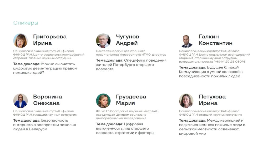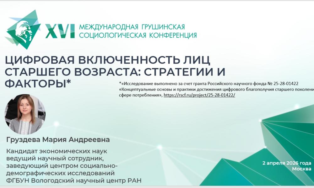 Результаты исследований ВолНЦ РАН представлены на секции «Цифровая интеграция пожилых людей: перспективы и проблемы» в рамках Трека 3. «Институты и социальные практики: тренды и сценарии развития».В докладе Марии Андреевны Груздевой представлен анализ выявленных в ходе реализации проекта факторов, определяющих цифровую включенность лиц старшего возраста, значимыми среди которых оказались возраст (сама исследуемая группа крайне дифференцирована), семейное положение, занятость в условиях цифровизации, доверие, семейное положение и совместное проживание с представителями других поколений (дети, внуки). Сформулированы стратегии цифровой включенности, отражающие дифференциацию внутри группы лиц старшего возраста по уровню цифровых навыков, частоте использования интернета и отношению к цифровым технологиям как составляющей субъективного благополучия.